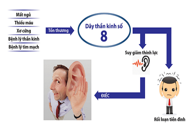 Rối loạn tiền đình khiến người bệnh có cảm giác chóng mặt, quay cuồng, hoa mắt, ù tai,... Thiếu máu, mất ngủ, huyết áp thấp, tắc nghẽn động mạch,.. là những nguyên nhân trực tiếp gây ảnh hưởng xấu đến não bộ và tế bào mô thần kinh, từ đó gián tiếp gây tổn thương dây thần kinh dẫn truyền.